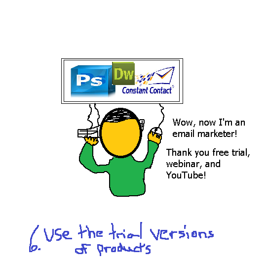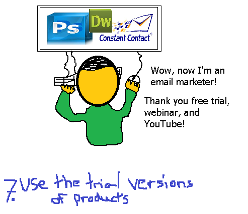 Constant Contact, Camtasia, Photoshop, and Dreamweaver offer free trials. Download them and use them. Watch webinars on YouTube and on company websites. Buy a book. Wow, now you have experience in email marketing, social media marketing, and image & video editing!