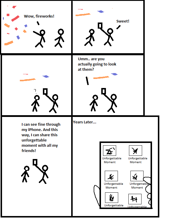 Ever since the paintings on cave walls, we’ve sought to confirm our existence in the world by forcing a narrative onto it. People recorded the fireworks so they could have the option of seeing them forever.