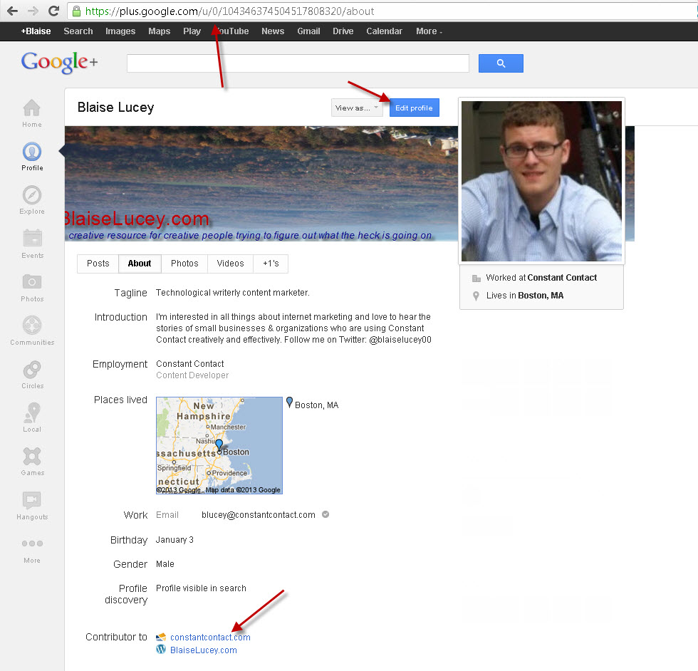 To do this, click the “About” tab on your Google+ profile and edit the “Contributor to” information by clicking “Edit Profile” and then “Add custom link.”