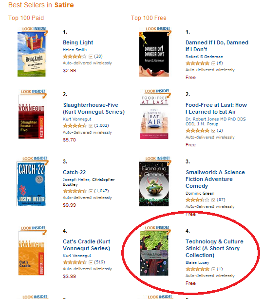 I curiously watched as my book rose the charts of the “Free Satire” category, where it rested at #4 and moved around between #4 and #10.