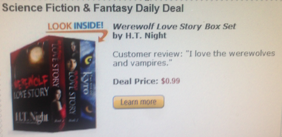 After about five minutes of listless clicking, I stumbled upon the Kindle Daily Deal pages. And, in front of me, I saw the future of eBooks: a boxed set. Werewolf Love Stories. Three for a dollar.