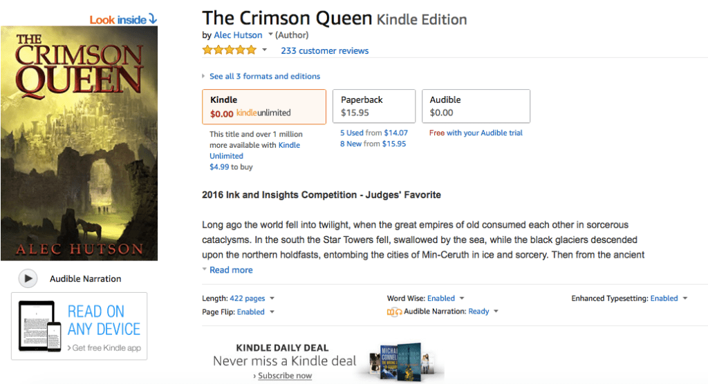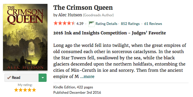 When my friend gave me a copy of The Crimson Queen, I wasn’t sure what to expect. It’s hard to find a good fantasy book. Especially in the world of self-publishing. But it was a great book. Far better than the absolutely dreadful Queen of the Tearling, which can be found recommended in New Yorker blogs and National Bestseller lists alike. It’s rated higher, too.