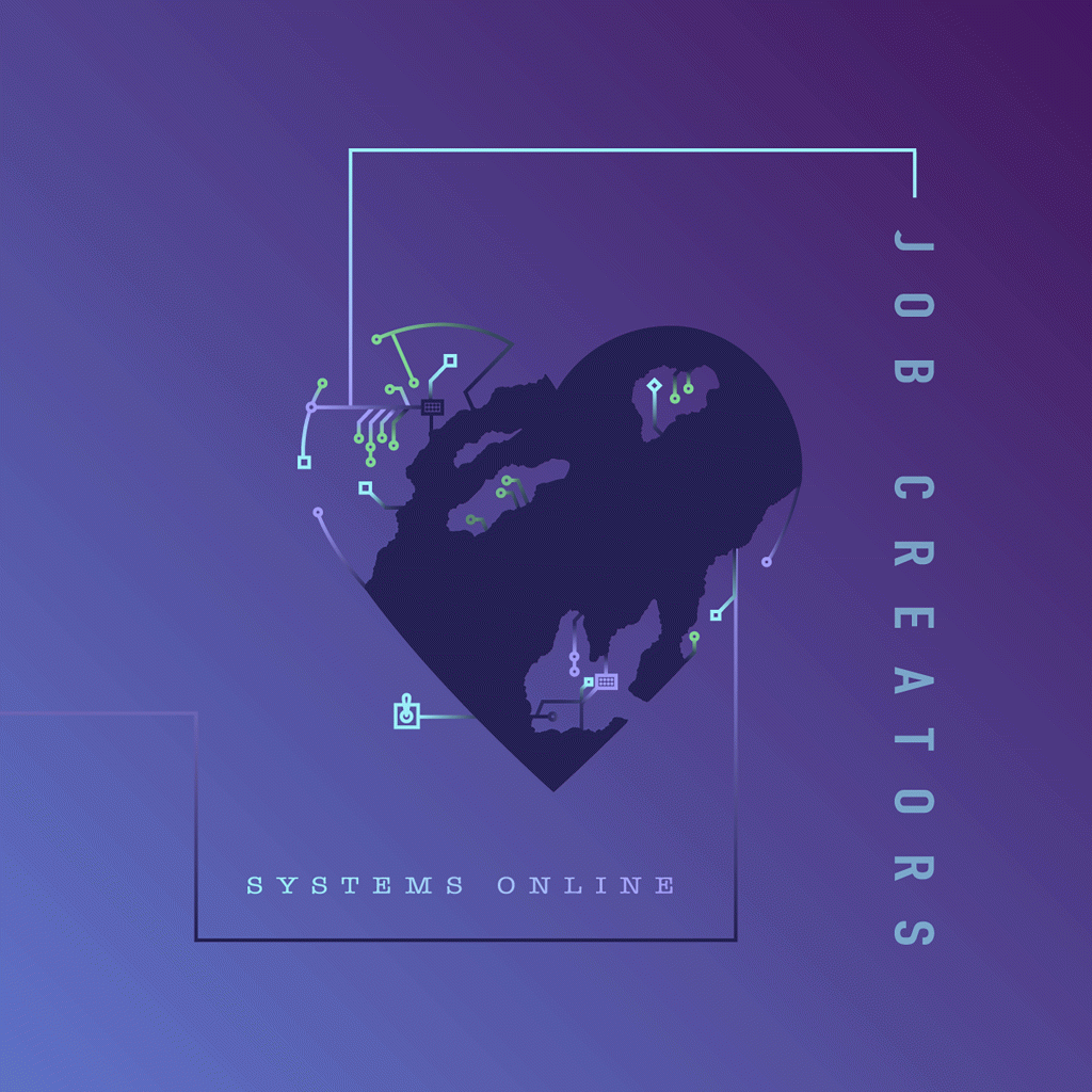 Tim, the drummer for Job Creators, and I have tried to build an album to really emulate what that strange feeling of half-virtual, half-physical feels like. In “Systems Online,” we explore the process of becoming aware of where your self and your soul ends and the other begins, especially in light of an event.